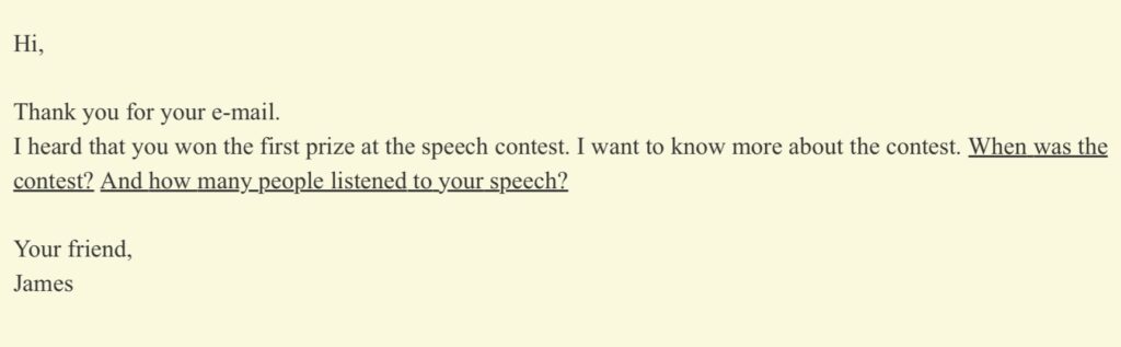 Eメール問題では、「文章中の2つの質問について答える」→「自分の感想を答える」のが基本の流れです。